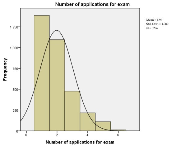 The average score for all students was 2.18, where 1 was the weakest (failed exam) and 5 the best (Table 4). This average reflects the fact that the students found it very difficult to pass the exam. The number of test applications shows how many times the exam was taken. It can be seen that the range was large (5), that is, there were students who tried (repeated the topic) six times. Most of them passed the exam the first time, but the average did it the second time.