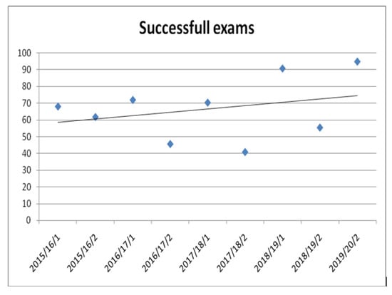 Figure 2 does not show a continuous increase in efficiency, i.e., decrease. The values varied by semester. However, the trendline showed a slight increase. On the basis of these, we can state that the exam results of the nine semesters did not show a significant improvement but rather stagnation, although, based on our digital environment and the interest in digital devices, we could assume that student performance improved. To improve this, new methods would need to be applied in education.