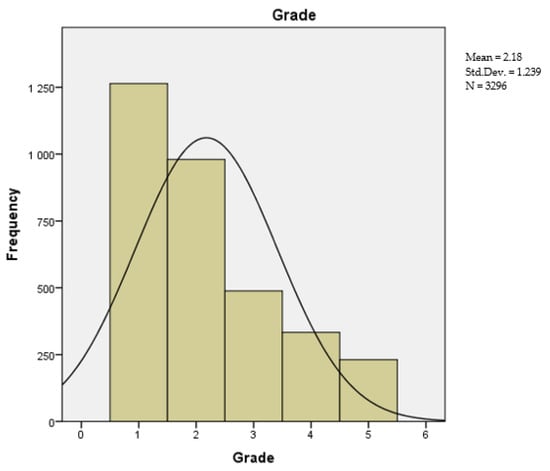 In the first step of the analysis, data filtering was performed. As the data were available in the Institution’s internal ERP system (NEPTUN), the first task was to extract the required records from the available database with tens of years of data. We could not use a well-defined method because we did not have the structure of the database system and built-in complex filtering tool. Therefore, a hierarchical heuristic filtering was performed []. Neptun records all data throughout the students’ academic lifecycle. Not only grades but also logins, course enrollments, etc. In our case, this was the basis of the study. This system has several filtering options. We applied the filters to the period, subject and grades. These data are quite representative, as 33% of the business informatics training in Hungary during this period was covered by the respective Budapest Business School institution. Therefore, the data can be considered representative. The data cleaning was performed by the software system itself through the data cleaning function of the Neptun system. The data received were already cleaned and filtered. In other words, we conducted a complete query for the years under review, from which we automatically deleted the fields necessary to identify the students; we conducted this using our own small manual-tuning software. Based on the anonymous records of the order of 100,000, we created a processing database that had to be further filtered. Then, in the next step, we had to find what could identify the object within the given records, and we also had to determine which encoding, in the case of different encodings (the code could change from year to year), could be considered the same. Filtering was easy from this point on. The results of filtering clearly determined all the exam results related to the OO planning and programming subject of the Budapest Business School for the last 5 years. Thus, we obtained a database of 3296 records, whose structure was explored and was considered suitable as input to the IBM SPSS Statistics application. Then, in the last step, we performed a simple frequency study and searched for a fit to the distributions []. After the tests, the obtained results were evaluated.