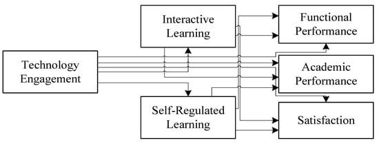 The proposed research investigates the use of technology with the mediating role of interactive and self-regulated learning that sustains satisfaction, academic and functional performance. The performances are validated in student outcomes, affirming academic and social attainment retention. Previous studies were restricted to a single learning factor (such as mLearning/self-regulated learning/eLearning), which is not adequate for students in higher education []. However, it was concluded that sole emphasis on technology usage is misleading []. Our primitive concern was to mediate the relation of technology engagement via digital learning. Technology engagement via self-regulated and interactive learning as mediators generates different performance features: (a) between technology engagement and satisfaction, (b) between technology engagement and academic performance, and (c) between technology engagement and functional performance.