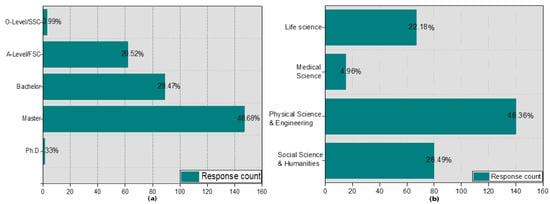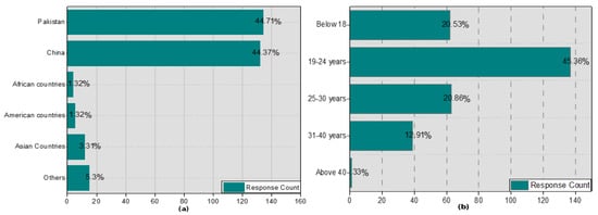 The targeted respondents in this research are included across different countries/continents, thus validating MI within-study; students from China and Pakistan are considered country-wise. At the same time, the rest of the respondents are categorized continent-wise (see Figure 2a). Since the selection of respondents was not biased to a country/continent; therefore, we prefer to include responses from different cultural and geographical backgrounds. The respondents received diverse responses, and we collected a sample size of 302 based on probability-based sampling formula using a margin of error (5%) and a confidence interval of 95%. Demographically, 51.66 were female and 48.34 male, where the age of respondents was categorized in different levels (see Figure 2b). The data was collected through a structured questionnaire (see Supplementary Materials for a questionnaire sample). The respondents’ information, who participated in this research, such as educational background and field of interest, is shown in Figure 3a,b), respectively.