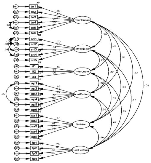 We performed the Pearson correlation (see Table 3) in SPSS v.21 to test the relations between the variables. We found a significant relation of technology engagement with self-regulated learning (r = 0.226, p < 0.05), with interactive learning (r = 0.292, p < 0.05), with academic performance (r = 0.451, p < 0.05), and with satisfaction (r = 0.217, p < 0.05). However, technology engagement is negatively related to functional performance (r = −0.08, p > 0.05), whereas self-regulated learning has significant relationship with interactive learning (r = 0.659, p < 0.05), academic performance (r = 0.308, p < 0.05), satisfaction (r = 0.218, p < 0.05) and functional performance (r = 0.119, p < 0.05). Similarly, interactive learning has significant relationship with academic performance (r = 0.351, p < 0.05), satisfaction (r = 0.320, p < 0.05), and functional performance (r = 0.211, p < 0.05).