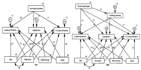 We first established the direct relations in a separate structural model to express the outcome and exploration of technology engagement via self-regulated and interactive learning. Structural model 1 (see Figure 5a) depicts hypothesis testing via direct relation of technology engagement significantly affects satisfaction and academic performance. In addition, performance has an outcome on academic performance and satisfaction (see Table 4; Structural Model 1), such as (β = 0.199 p < 0.05), (β = 0.393, p < 0.05), which fully supported H1, respectively. Conversely, technology engagement does not significantly affect functional performance, which has not supported H2. Structure model 2 (see Figure 5b) shows that self-regulated learning also significantly influences satisfaction and academic performance. The performance outcome of self-regulated learning (see Table 4; Structural Model 2) on satisfaction (β = 0.187, p < 0.05), and academic performance (β = 0.248, p < 0.05), which fully supported H3, respectively. However, self-regulated learning has not significantly influenced functional performance, not supporting H4.