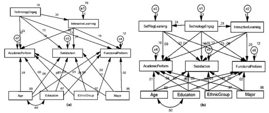 Structural models 4 and 5 (see Figure 6b and Figure 7a) shows that student having direct relation to technology engagement via self-regulated and interactive learning contributed positively to satisfaction, academic, and functional performance. In particular, result performances (see Table 5; Structure Model 4) indicated that technology engagement via self-regulated learning has a significant influence only on academic performance (β = 0.177, p < 0.05), which fully supported H6. Technology engagement via self-regulated learning has positively contributed to satisfaction (β = 0.154) and functional performance (β = 0.109), partially supporting H7. In contrast, result performances of technology engagement via interactive learning (see Table 5; Structure Model 5) found significant influence on satisfaction (β = 0.238, p < 0.05), academic performance (β = 0.194, p < 0.05), and functional performance (β = 0.188, p < 0.05), which fully supported H8.