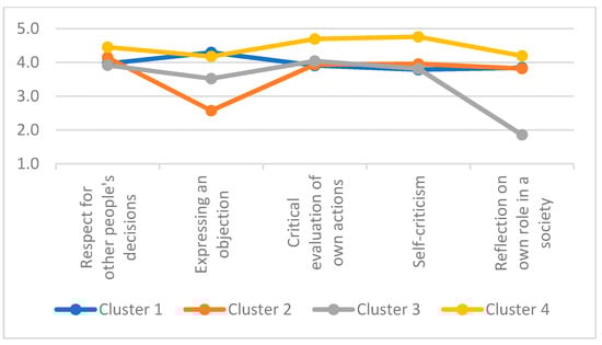In the area of knowledge, four clusters with respect to the self-assessment of competences were distinguished, with 90, 64, 56 and 98 cases per cluster, for clusters one to four, respectively (Figure 2).
