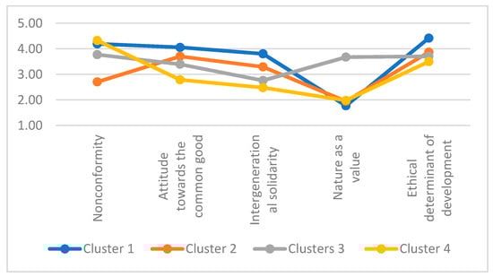 In the area related to ethics and values, four clusters were distinguished (Figure 8) numbering 124, 61, 71 and 52. The average self-assessments for individual statements in each cluster are presented in Table 8.