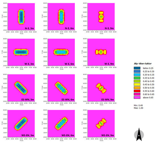 Figure 2 shows the SVF values for the pavement with different orientations and spacing at a height of 1.5 m from the ground. Table 3 presents the SVF distribution at the pavement level at 1.5 m below different plant spacings. Based on its size, the SVF was divided into highly shaded areas (SVF < 0.3), medium shaded areas (0.3 < SVF < 0.5), and slightly shaded areas (SVF > 0.5) (Morakinyo et al., 2018) [19] The SVF values of 3 m pavements in all directions were basically lower than 0.25, the SVF values of 6 m pavements in all directions were between 0.40 to 0.45, and the SVF values of 9 m pavements in all directions were mainly between 0.45 to 0.50 and 0.50 to 0.55. The average SVF of the pavement with a tree spacing of 3 m was 0.24; 62.90% of the area was highly shaded, and 33.88% of the area was moderately shaded, with optimal shading. The average SVF of the pavement, with a plant spacing of 6 m, was 0.32, and 94.09% of the area was moderately shaded, with good shading conditions. In contrast, the average SVF of the pavements with a plant spacing of 9 m was 0.48, and 58.07% of the area was slightly shaded, whereas only 41.91% of the area was moderately shaded. Some areas even had SVF values > 0.7, representing a sun-exposed open space with poor shading.