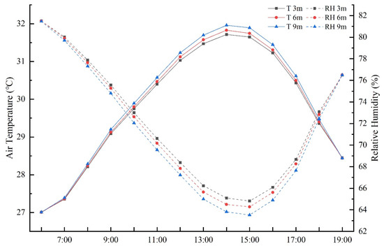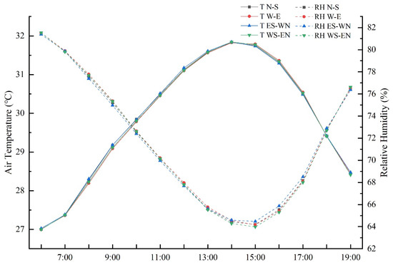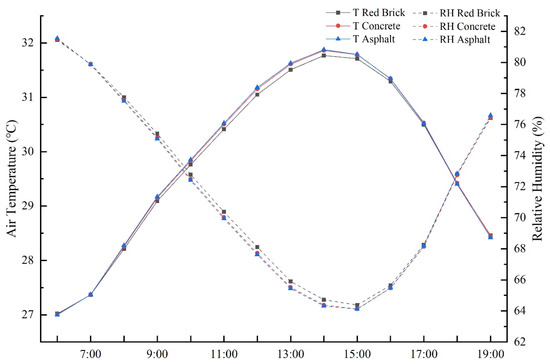 Figure 11 shows the chronological changes in the temperature and humidity of the underlying pavement composed of red brick, asphalt, and concrete. The air temperature first increased and then declined, while the trend in the relative humidity was the opposite. There was no significant difference in the air temperature and relative humidity between concrete and asphalt. The air temperature of red floor brick was slightly lower than that of asphalt and concrete during the simulation period; the average temperature was 0.05 °C lower than that of asphalt and concrete.