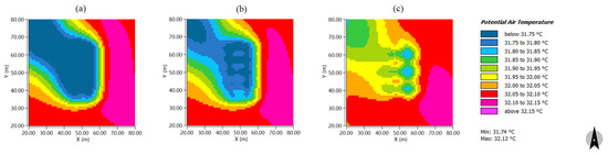 Images of air temperature at a height of 1.5 m from the pavement under different plant spacings at 15:00 h from south to north facing the pavement: (a) a N–S pavement with a spacing of 3 m; (b) a N–S pavement with a spacing of 6 m; (c) a N–S pavement with a spacing of 9 m.