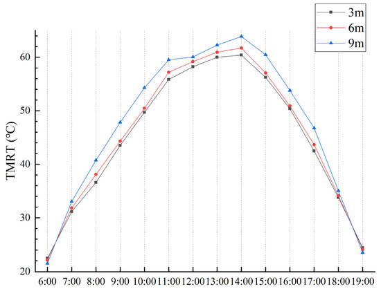 Figure 5 shows the variation in Tmrt at a pavement height of 1.5 m with different spacings as a function of time. Tmrt increased until 14:00 h and then decreased; the average Tmrt values for the 3, 6, and 9 m pavements were 44.66 °C, 45.41 °C, and 47.34 °C, respectively. The Tmrt value of the pavement with 9 m spacing was significantly higher than that of pavements with other spacings. The maximum difference was 4.58 °C and 3.80 °C at 10:00 h, owing to the difference in the pavement heating rate caused by different plant spacings. Among them, the pavement with 9 m spacing had a significantly higher heating rate than the pavement with the other two spacings.