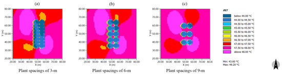 Figure 6 shows a PET cloud image of the N–S pavement at 14:00 h under different plant spacings. The statistical analysis of the grids from (48, 65) to (53, 35) yielded the following: (a) When the plant spacing was 3 m, the average PET along the pavement was 44.39 °C, and the distribution was relatively uniform, with 85.03% of the area having 44–45 °C. (b) When the plant spacing was 6 m, the average PET along the pavement was 45.08 °C, and some areas of the pavement had local high temperatures; 67.38% of the area had 44–45 °C, whereas areas >47 °C accounted for 17.65%. (c) When the plant spacing was 6 m, the average PET along the pavement was 46.05 °C, and some areas were overheated. Among them, the area with PET > 47 °C accounted for 44.92%, whereas the area with PET of 44–45 °C only accounted for 44.92%.