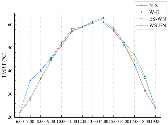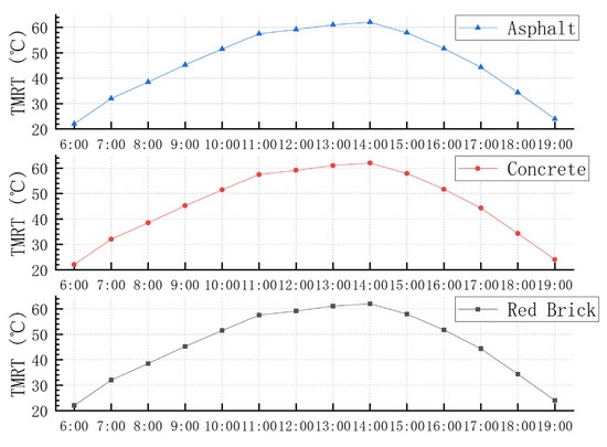 Figure 13 shows a comparative analysis of the Tmrt values for red brick, asphalt, and concrete, and the black curve basically coincides with the blue curve. There was no significant difference in the Tmrt values of the underlying surface of the three materials, indicating that it had no significant effect on the Tmrt.