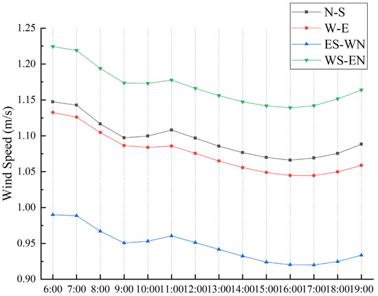We compared the Tmrt of the pavements with different orientations (Figure 8). The south–north orientation of the pavement varied significantly; the Tmrt value was higher than that of pavements of other orientations. The Tmrt value changed steadily in the E–W direction; there was no notable sharp rise or decline. Figure 9 shows a comparison of the wind speed of the pavements in different directions. The changes in the wind speed in each direction were similar. The wind speed along the southwest (SW)–northeast (NE) pavement was significantly higher than in pavements of other orientations; the average wind speed was 1.17 m/s. The wind speed of the south–north and east–west pavements were relatively similar, that is, 1.1 and 1.08 m/s, respectively. The wind speed in the SE–NW direction was significantly lower than the other pavements, with an average wind speed of 0.95.