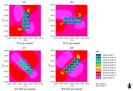 Comparison of the physiological effective temperature (PET) with pavement orientation: (a–d) are models with different pavement orientations.