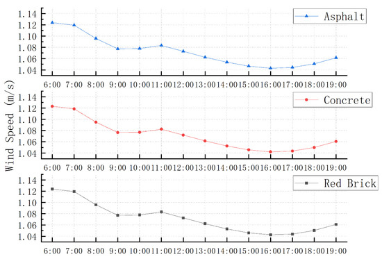 Figure 12 shows a comparative analysis of the wind speed for red brick, asphalt, and concrete, and the three curves in the figure basically coincide. The wind speed of the underlying concrete surface was only 0.001 m/s lower than that of the two other underlying surfaces, which may have been related to the ground roughness of the underlying surface.