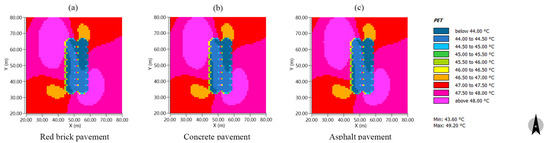 Figure 14 shows a PET cloud map of the S–N pavement on different underlying surfaces at 14:00. The various underlying surface materials had no significant effects on the PET distribution of the pavement. The average PET of the red floor brick, asphalt, and concrete was 45.08 °C, 45.13 °C, and 45.14 °C, respectively. The PET of the asphalt and underlying concrete surfaces was very similar, but the red tile underlying surface was 0.05 °C lower than that of the two other materials. As the comparison results of other road surfaces are almost the same as those of the north–south road surfaces, only one set of data results is selected for display.