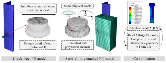Based on the above description and discussion, the fatigue crack propagation of stud connectors was analyzed by the finite element method of LEFM in this study, and the variation of SIFs during the propagation process was studied. The M-integral method was adopted to calculate the SIFs [24], which were co-simulated by fracture mechanics software Franc 3D and general finite element software Abaqus. The method of co-simulation is shown in Figure 1, and the specific operation process is as follows: First, the structure was modeled by Abaqus software version 6.20 (crack-free FE model), and the material properties, boundary conditions, and contact relationships were defined. Then, fatigue cracks were introduced into the initial defect positions of stud connectors as shown in Figure 1 and the semi-elliptic cracked FE model was established.