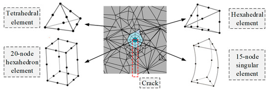 After the initial cracks were introduced, the mesh of the sub-model needs to be redivided, which used a variety of types of elements as shown in Figure 2. To be specific, the tetrahedral element was adopted to divide the global mesh. The elements of the crack tip were composed of three-ring, the 15-node singular element, and the 20-node hexahedral element were adopted to define the inner ring and outer ring, respectively. The pentahedral element was adopted between the outer ring and the global mesh for transition. After the above steps were completed, the calculations of the finite element were performed. The program automatically imported the calculation results into Franc 3D through Python script files, and the stress–strain field and displacement calculation results of the crack tip were processed, three types of SIFs (open, slide, and tear) were obtained, respectively. By defining the fatigue crack propagation parameters and the propagation step, redefining the crack surface, and dividing the mesh, the crack can be propagated. The Abaqus software was used for calculation again, and the cycle was followed until the set critical size was reached. Due to the large computational workload of the experimental model, the region to be performed for crack propagation analysis was defined as a sub-model, the sub-model was meshed separately with tetrahedron element and then assembled with the original model. The establishment of a sub-model greatly improves the computational efficiency of fatigue crack propagation analysis.