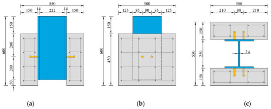 The push-out test is usually adopted to analyze the static and fatigue properties of stud connectors in steel-concrete composite structures. In this study, the specimens were designed according to the standard of Eurocode 4 [5,25], which is composed of I-steel plates, stud connectors, concrete plates, and structural steel bars. Two studs are arranged on each side of the steel plate by arc welding, 4 in total. The transverse spacing of the studs is 80 mm, and the detailed size and layout of the specimen are shown in Figure 3. To study the fracture mechanical properties of different sizes of studs, three stud parameters with different diameters and four different lengths were set. The detailed dimensions of the stud and welded collar refer to the specification of the cylindrical head stud [26]. Only a quarter of the models were built based on the symmetry of the specimens. The C3D8R element was used for concrete, steel beams, and studs. The truss element was used to define steel bars. The relation definition of the contact between the stud and concrete is important for calculation. In this paper, the contact between the two materials was set as face-to-face contact to simulate the combined action between those two materials. The tangential direction was set as a penalty function (the friction coefficient was taken as 0.4), and the normal direction was set as hard contact.