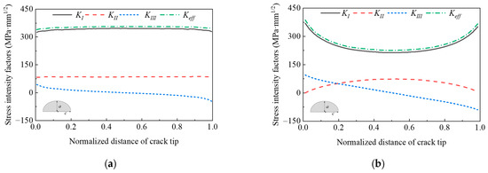 A series of calculations were performed through co-simulation presented in Figure 1. It is found that the SIFs of studs with different diameters under different shape ratios of initial crack are complex types dominated by the type I (open) SIFs, and the shape ratios of initial crack not only affect the size of the SIFs but also the distribution characteristics. Effective SIF (Keff) is used to evaluate the SIFs of complex fatigue crack, which is calculated by Equation (1), where the v represents Poisson’s ratio and was taken as 0.3. Figure 4 shows the distribution of SIFs with an a/c ratio of 0.2 and 1, respectively. Two characteristics are presented. One is the convex distribution with the maximum value at the center of the crack tip as shown in Figure 4a, and the other is the concave distribution with the maximum value at the two endpoints as shown in Figure 4b. It indicates that the driving force of fatigue crack propagation at the crack tip is different depending on the initial defect.