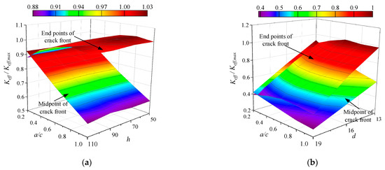 Comparison of Keff/Keff,max under different sizes of stud and crack. (a) Ratio of stud height and crack shape; (b) ratio of stud diameter and crack shape.