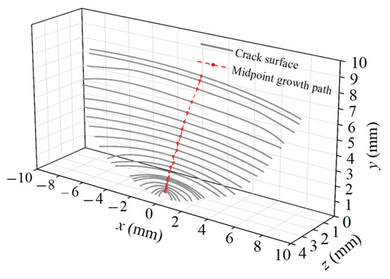 The propagation path and spatial state diagram of the crack surface as shown in Figure 6 were obtained. It can be seen from the figure that the fatigue crack has a fast speed along the length direction at the initial stage of propagation, and eventually develops into almost a straight line which is consistent with the test results conducted by Oehlers et al. [31]. Similar to the experimental results, the fatigue cracks obtained by finite element simulation also tend to develop toward the steel plate. The available experimental results indicate the dip angle of fatigue crack initiation at the interface between the stud shank and the weld collar [31,32]. For the convenience of calculation, the following analysis assumes that the initial fatigue crack of the stud extends only along the surface perpendicular to the stud shank.