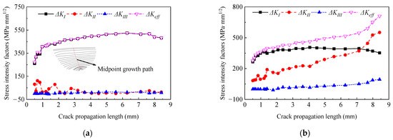 Variation curves of SIFs. (a) ΔKII/ΔKI and ΔKIII/ΔKI; (b) ΔKeff.