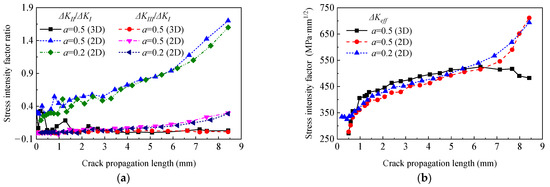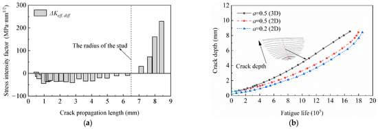 The ratio of ΔKIII and ΔKII to ΔKI with the change of crack propagation depth is summarized in Figure 8a. It directly shows the dominant relationship of complex SIFs with different propagation models and initial crack sizes, and the case where a0 = 0.2 and a0/c0 = 1.0 was also calculated. As can be seen from the figure that when the expansion depth is close to the size of the stud radius, the ΔKII/ΔKI both exceeds 1.0 under the plane expansion model in the case of a0 = 0.2 and a0 = 0.5. The effective SIF amplitudes of the two different extended models were compared, as shown in Figure 8b. It is found that the ΔKeff along the depth direction differs little in the early stage of fatigue crack propagation. However, the ΔKeff of the 2D model increases gradually when the crack propagation depth is greater than the radius of the stud, which could lead to a certain difference in the calculation of fatigue life values of the assumed propagation model.