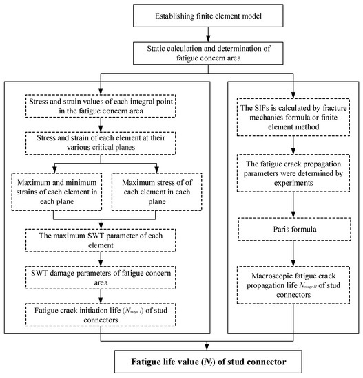 Although the fatigue crack propagation pattern of the stud was obtained according to the method above, since the stud connector is wrapped in concrete, and the contact between different materials with the complex element, the non-convergence of the calculation was quite frequent, which lead to a situation that it is still difficult for the fatigue to crack propagation calculation. Meanwhile, the fatigue crack propagation parameters for fatigue life calculation of the stud material still need to be determined by a lot of experiments. To evaluate the fatigue life of stud effectively, instead of only calculating the number of fatigue actions from the nominal stress amplitude according to the S-N curve, a relatively simple calculation method needs to be developed. Based on the above calculation, for fatigue crack propagation at the interface of stud shank and welded collar, the variation trend of SIFs under mixed-type crack propagation is not different from that of I-type crack propagation, in which the differences mainly exist in the post-cracking stage. Therefore, the study on the fatigue life of rubber-sleeved studs conducted by Xu et al. [30] was referred to in the study, and the fatigue crack propagation was simplified. Based on the classic S-N curve method, fatigue crack initiation life and macroscopic crack propagation life were considered, and the fatigue performance of the stud can be evaluated by the simplified fatigue calculation method of fracture mechanics. On the whole, the fatigue crack propagation process of stud connectors can be divided into the initial crack initiation stage (stage I), the fatigue crack stable propagation stage (stage II), and the crack unstable propagation stage (stage III). Stage III develops rapidly which is the last stage of fatigue failure, and it is acceptable not to be counted in the overall fatigue life. Therefore, the fatigue life (Nf) of the stud in this research was obtained by calculating the sum of the initiation life (Nstage I) and the stable propagation life (Nstage II) of crack. The Smith–Watson–Topper (SWT) critical plane damage method [33] for multiaxial fatigue was applied to calculate the crack initiation life Nstage I, and the stable extension life Nstage II was calculated by the LEFM method. The flow chart of stud fatigue life assessment is presented in Figure 10.