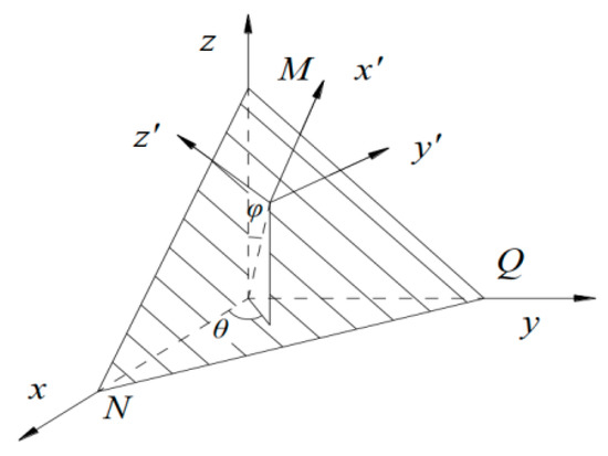 As mentioned above, the most unfavorable position needs to be determined before fatigue life calculation and analysis, and then the maximum SWT parameter and its corresponding critical plane direction were calculated. To be specific, firstly, the stress distribution of the stud connector in the steel-concrete specimen was calculated, and the most unfavorable position under fatigue load was preliminarily determined. Then, SWT parameters of the element at the most unfavorable position were evaluated. Finally, the normal stress–strain component of any plane was obtained through the coordinate transformation matrix as shown in Figure 11. The coordinate transformation formula is shown in Equation (5). In Figure 11, the coordinate system before transformation is xyz, and a new coordinate system x′y′z′ is obtained after a coordinate transformation. Based on the above calculation of the most unfavorable position and the corresponding critical plane of fatigue crack, the fatigue initiation life of the stud was calculated according to Equation (4).
