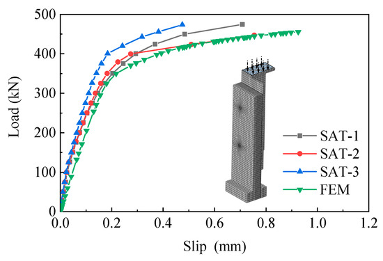 Firstly, the static performance of the stud connector obtained by the finite element method was verified. Three push-out specimens (SAT-1~SAT-3) with the same parameters were carried out by Cao et al. [19], and the slip and ultimate bearing capacity of the stud were recorded. The comparison between the load-slip curve calculated by the finite element model and the test results is shown in Figure 13. It can be concluded from Figure 13 that the results calculated by the finite element model are consistent with the measured load-slip curve, and the results are most similar to those of specimen SAT-2. The stud in the UHPC deck of the static performance is mainly divided into two stages, at the beginning of the load, a load of stud-slip can be regarded as a linear correlation, and then the stud material yields strength after the interface slip velocity gradually accelerated, until you reach the limit strength stud shear failure occurs, these characteristics are also reflected in the finite element calculation results. The yield load and ultimate load measured in the experiment are 400 kN and 496 kN, respectively. Comparatively, the yield load calculated by the finite element method is relatively small which are 376 kN and 456 kN, respectively. The errors between the finite element model and experiment are 6% and 2%, respectively, which is acceptable for the prediction of the shear bearing capacity of the stud connectors. The above analysis shows that the calculation results of the finite element are in good agreement with the experimental results. The verification of the static experiment model provides the basis for the following calculation, and the fatigue life values calculated in Figure 10 are verified by the fatigue test results below.