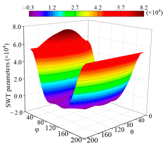 In Equation (5), σ and ε represent the normal stress and strain after the transformation plane, nx, ny, and nz represent the cosine of the angle between the post-transformation coordinate system and the pre-transformation coordinate system, respectively. The calculation formula is as follows. Firstly, the stress and strain components in Equation (5) were extracted from the calculation results of the finite element model, and the angle parameters θ and φ in Equation (6) were successively evaluated from 0° to 180° which was separated by 10°. Then, the direction cosine value was calculated through Equation (6) and substituted into Equation (5). Finally, the normal stress and strain after coordinate transformation were obtained, which were used for the subsequent calculation of SWT parameters and fatigue life.