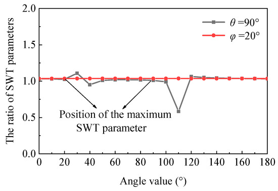 The stud fatigue life values in UHPC with different elastic modulus and compressive strength were calculated, and the material was set as UHPC with the elastic modulus of 43 GPa and compressive strength of 170.9 MPa as described in the literature [35]. The SWT damage value of the most unfavorable element of the stud was calculated as shown in Figure 15. It can be seen from the figure that SWT damage patterns of different intensities are similar in distribution, and the maximum SWT damage value was 71,810 which is lower than the value of the N1 specimen with the compressive strength of 129.1 MPa. The calculated fatigue initiation life value is 12.59 million times, and the stable extended life value is 892,000 times after changing the material parameters of UHPC. Figure 16 presents the ratio of SWT parameters of UHPC with different compressive strengths, and it is that only the values with θ = 90° and φ = 20° were compared for convenience. Based on the above discussion, it can be seen that there are certain differences in the fatigue performance of studs in concrete with different strengths, and the ratio is almost uniform except for a few points, especially when φ = 20°.