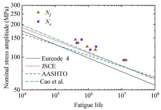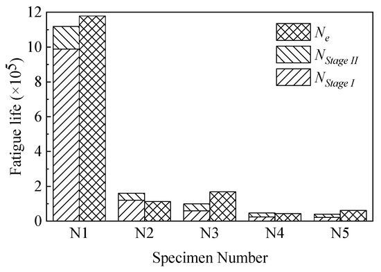 SWT parameter and normal stress amplitude Δσ were obtained according to the above calculation, the initiation life (Nstage I) and the stable propagation life (Nstage II) of crack can be calculated by Equations (4) and (8). As shown in Table 2, the fatigue test results (Ne) and calculation results (Nf) of specimens N1~N5 are summarized, the relationship between stress amplitude and fatigue life of stud is usually expressed by logarithmic relation. The error between logNe and logNf ranges from 0.5% to 7.7%, and the results of logNe/logNf range from 0.98 to 1.04, which shows that the calculated results have a good correlation with the experimental data. By further calculation, the correlation coefficient between the calculated results in this paper with the experimental results is 0.9955. The above analysis shows that the method of predicting the fatigue life by considering the fatigue initiation life and stable extension life of the stud is feasible. Among all the specimens, the predicted results of N1 were closest to the experimental values.