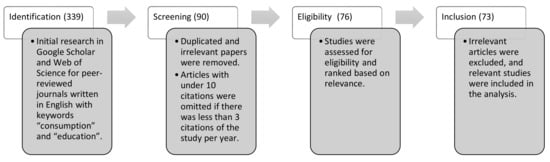 The literature search is concentrated on previously published research that is involved to any extent in both the subjects of education and consumption. This study included searching three widely used databases, which are Google Scholar, Scopus, and Web of Science, for the relevant articles surrounding education and SC research. Relevance of the articles is based upon several selection steps which include identification, screening, eligibility, and finally, inclusion. The selected databases for the literature search are highly utilized, and they provided a considerable number of peer-reviewed journals with high impact factors for the subjects of concern in this study; however, we acknowledge that not all publications are included in these databases.