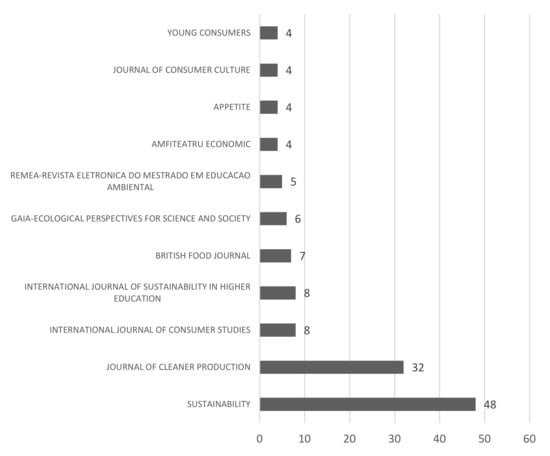 The publications surrounding this topic, over the period that the literature review was conducted, covers 1994 until 2021. Considering the journals in the literature review, Figure 4 illustrates the top journals with a total of 114 articles. The papers mainly appeared in Sustainability, with 48 of the papers, followed by the Journal of Cleaner Production, with 32 of the papers, and the International Journal of Consumer Studies and International Journal of Sustainability in Higher Education, both with 8 papers each. The journals with the number of papers that accounted for more than 1% of the total papers conducted in the literature review are represented in Figure 4. Roughly a quarter of the published articles identified within this literature review are presented within just two journals, Sustainability and the Journal of Cleaner Production.