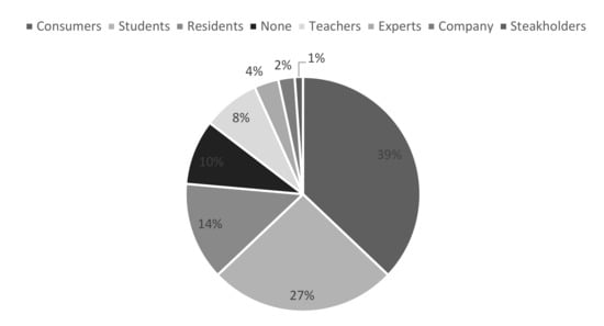 Examining the subjects that have been considered in these studies, within the literature review, the greatest percentage of the subjects studied are general consumers. Consumers amount to 39% of the subject studied, followed by Students (27%), Residents (14%), and Teachers (8%). Field experts, companies, and stakeholders involved in consumption are considered within the papers as subjects; however, in a less significant amount with a total percentage of 7% across all relevant papers considered (Figure 5). Students shape a significant portion of the subjects considered within these articles, and thus, the effect of education on SC can be further examined.