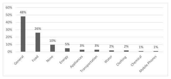 Although significant, general consumption would benefit from further examination under several subcategories, as certain consumption types such as food, when combined with other types of consumption, might reduce the capacity for detailed assessment of consumer behaviors. Several papers within the literature review have considered detailed consumption types, although not in a significant amount compared with general, food, and energy consumption. Notable consumption types considered in the literature examined the consumption of appliances, transportation, water, clothing, chemicals, and mobile phones. The total percentage of these consumption types accounts for 12% of the total papers within the literature review (Figure 6).