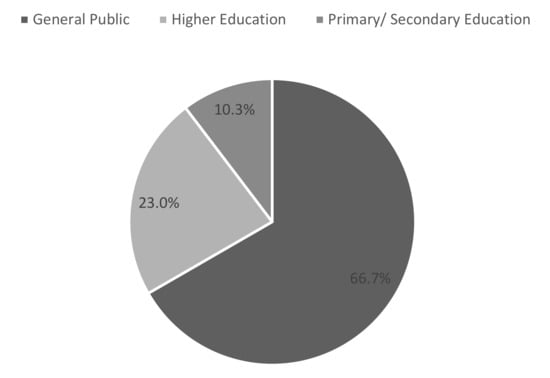 Assessing the location of the studies within the papers in the literature, the greatest percentage of studies is conducted outside of educational settings. Roughly 67% of the studies considered public settings for their research. These public setting subjects, such as consumers, residents, and so on, are where the data is collected from; however, within educational settings, higher education institutes amount to a larger portion (23%) in contrast to primary/secondary education settings (10%) (Figure 7). Focusing upon educational settings for understanding SC, higher education articles have the greatest volume to examine.