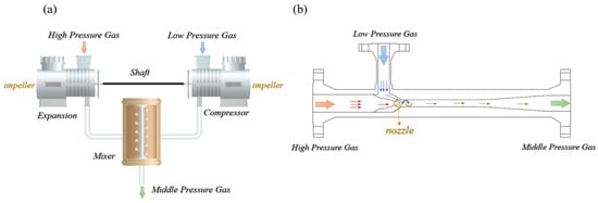 The employment of pressure energy transfer devices for comprehensive pressure energy recycling and extraction can significantly reduce the waste of energy and resource in industrial production [1,2]. In the field of natural gas exploitation and utilization, for example, the surplus pressure energy of high pressure gas wells over the gathering pressure can be used to supercharge low-pressure gas wells. It can avoid the waste of energy caused by throttling and depressurizing high-pressure gas, while also reducing the external power consumption required to pressurize and extract low-pressure gas [3,4]. In industry, the expansion-compressor units and static ejectors are commonly used for energy transfer. As shown in Figure 1a, the expansion-compressor units whose core components is impeller are made up of coaxially coupled expansion and compression. It is highly efficient and has a wide range of working conditions. However, the high rotational speed of impeller results in high costs of manufacturing and operating. It also has strict purity criteria of the fluid, limiting its usage in industrial production like natural gas extraction [5]. In contrast, as shown in Figure 1b, the static ejector whose core component is nozzle has the advantages of simple structure, low costs, high stability, and the ability to operate with impurities. However, the isentropic efficiency of static ejector is rather low due to the substantial viscous loss caused by turbulent mixing [6,7,8,9].