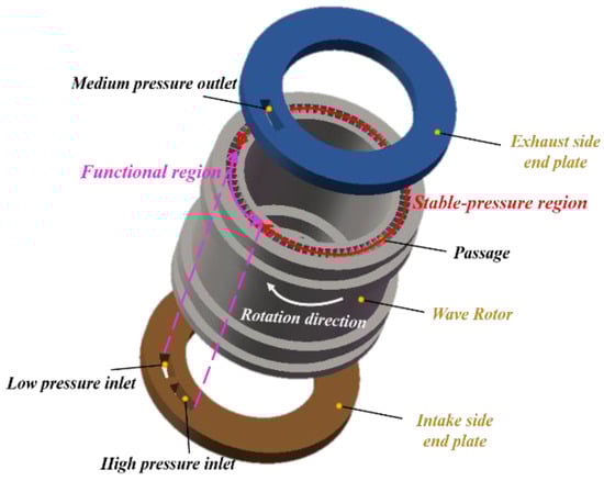 Due to the issues of both devices mentioned above, the gas wave ejector (GWE) [10] which combines the benefits of expansion-compressor units and static ejector has received more and more attention. Similar to other wave rotor technologies [11,12,13,14,15], the core components of GWE, as shown in Figure 2, are a wave rotor made up of uniformly distributed channels and the end plates with pressure ports on both sides of the rotor. And the wave rotor rotates between the intake and exhaust end plates when the device is running. As different pressure gases enter through the ports, shock and expansion waves are created to transfer energy between gases with various pressures in the channels. GWE mainly transfer energy through pressure waves rather than mechanical components like impellers. Therefore, GWE has advantages of high isentropic efficiency, low rotational speed, low manufacturing and operating costs, easy disassembly and maintenance, and a strong capacity to run with liquid and solid. As a result, it has been considered for application in a variety of fields, such as the exploitation of natural gas, refrigeration cycles, and so on [16,17,18,19].