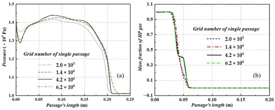 Figure 4 shows the pressure distribution and mass fraction curves at 0.6 ms after the channel starting to connect with the high-pressure port. When the number of grids in a single channel reaches 4.2 × 104, the numerical model can accurately capture the low-pressure area caused by vortices at the entrance of channels (around 0.015 m away from the channel inlet end) and the small pressure fluctuations that occurred after the action of multiple pressure waves, as illustrated in Figure 4a. The distortion of contact surface during propagation can be accurately captured at this grid scale, resulting in a significantly different mass fraction distribution in Figure 4b compared to the models with less grids in a single channel. It can also be found that the calculation results of each parameter basically no longer change when the number of single channel grids exceed 4.2 × 104. Thus further mesh refinement has no significant impact on the calculation results. Therefore, the grid number of single channel was chosen as 4.2 × 104, and the total grid number of the model is around 1.22 × 106.