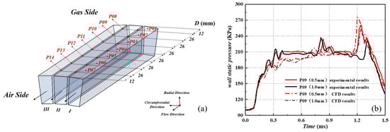 The accuracy of simulation model was verified according to the test results from the wave rotor internal pressure by Okamoto et al. [26] at the University of Tokyo. Figure 5a shows the diagram of their testing device which consists of three stationary channels and two rotating pressure nozzles at both ends of channels. Considering the mutual influence between adjacent channels, the point P09 in the middle channel II was chosen for the pressure monitoring and comparing. As shown in Figure 5b, there are minor differences between the simulation and the experimental results with different sizes of gaps that ensure the relative movement between the channels and pressure ports. Furthermore, the shape and the peak position of the pressure curves are essentially identical. The above results proves that the simulation model in this study can accurately predict the formation and propagation laws of pressure waves, and it is applicable to calculate the flow inside the wave rotor channels.