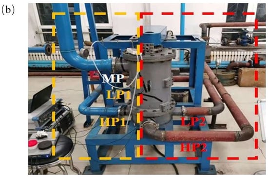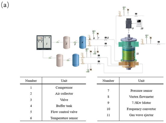 The experimental system shown in Figure 6 was established to obtain the actual working performance of the GWE collaborative production mode. The GWE experimental equipment was driven by a motor whose speed was adjusted by a frequency converter. The high-pressure inlet gas was provided by a compressor, and the gas collector and buffer tank were used to ensure the stability of the air supply during the experiment. The valves were used to control the pressure of the high, low and middle-pressure ports. In addition, sensors and micromanometers were used to measure the temperature, pressure at each pressure port. Besides, the mass flow rate at each port was measured by the vortex flowmeter. Table 3 displays the specific parameters of the control and measurement instruments.