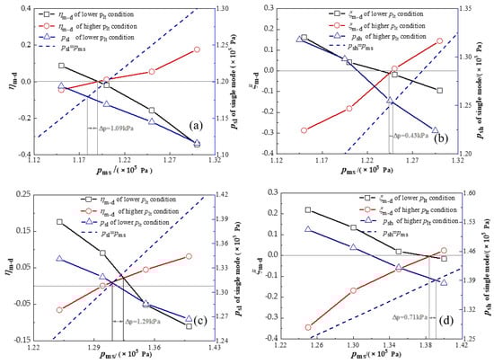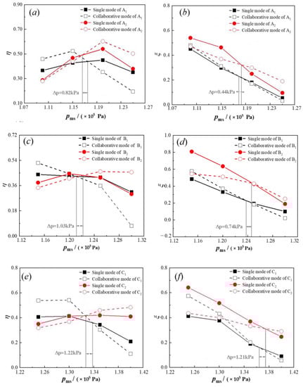 As shown in Figure 8a,c,e, the curves of η in different modes intersect on the same working conditions, and the static pressure of middle-pressure port pms corresponding to the intersection points in a group of working conditions are nearly identical (for example, pms of intersection point of both modes on condition A1 is nearly equal to that on condition A2). It indicates that when η of one working condition in collaborative mode is higher than that of the single mode, η of the collaborative mode on the other working condition in the same group became relatively worse. The variation laws of η with pms in both modes are exactly consistent at each condition, and the pms for achieving the maximum η are also basically identical. On the fixed gas intake conditions, though the collaborative mode results in a change in value of η when compared to the single mode, it may not change the variations of η with pms on each working condition.