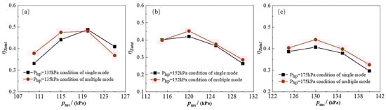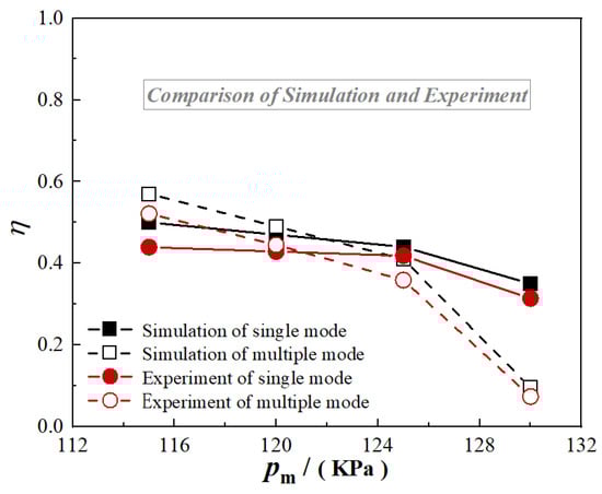 Figure 10 shows the variations of η in different modes obtained by numerical simulations and experiments on condition of pht = 152 kPa and plt = 101 kPa. Although the numerical η obtained in both modes are slightly higher within 4.4% than the actual experimental results, the variations of η with pms remains nearly consistent in both modes, proving the rationality of the calculation in this study.