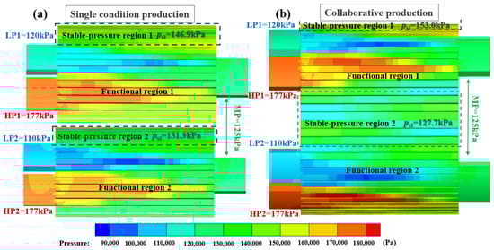 Pressure contours of different working modes on conditions 1 and 2. (a) Pressure contours on single mode; (b) Pressure contours on collaborative mode.