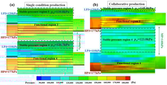 Pressure contours of different working modes on working conditions 3 and 4. (a) Pressure contours on single mode; (b) Pressure contours on collaborative mode.