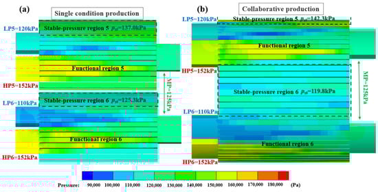Pressure contours of different working modes on working conditions 5 and 6. (a) Pressure contours on single mode; (b) Pressure contours on collaborative mode.