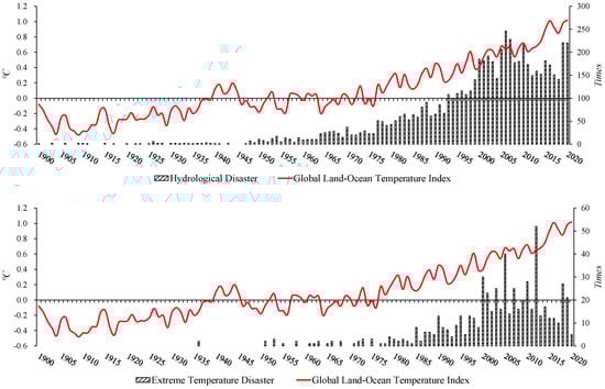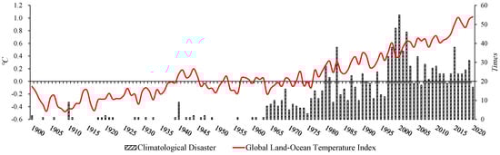 Land-Ocean Temperature Index, Climatological, Hydrological, and Extreme Temperature Disaster. Data Source: www.emdat.be, accessed on 18 March 2022, GISS Surface Temperature Analysis (GISTEMP v4).